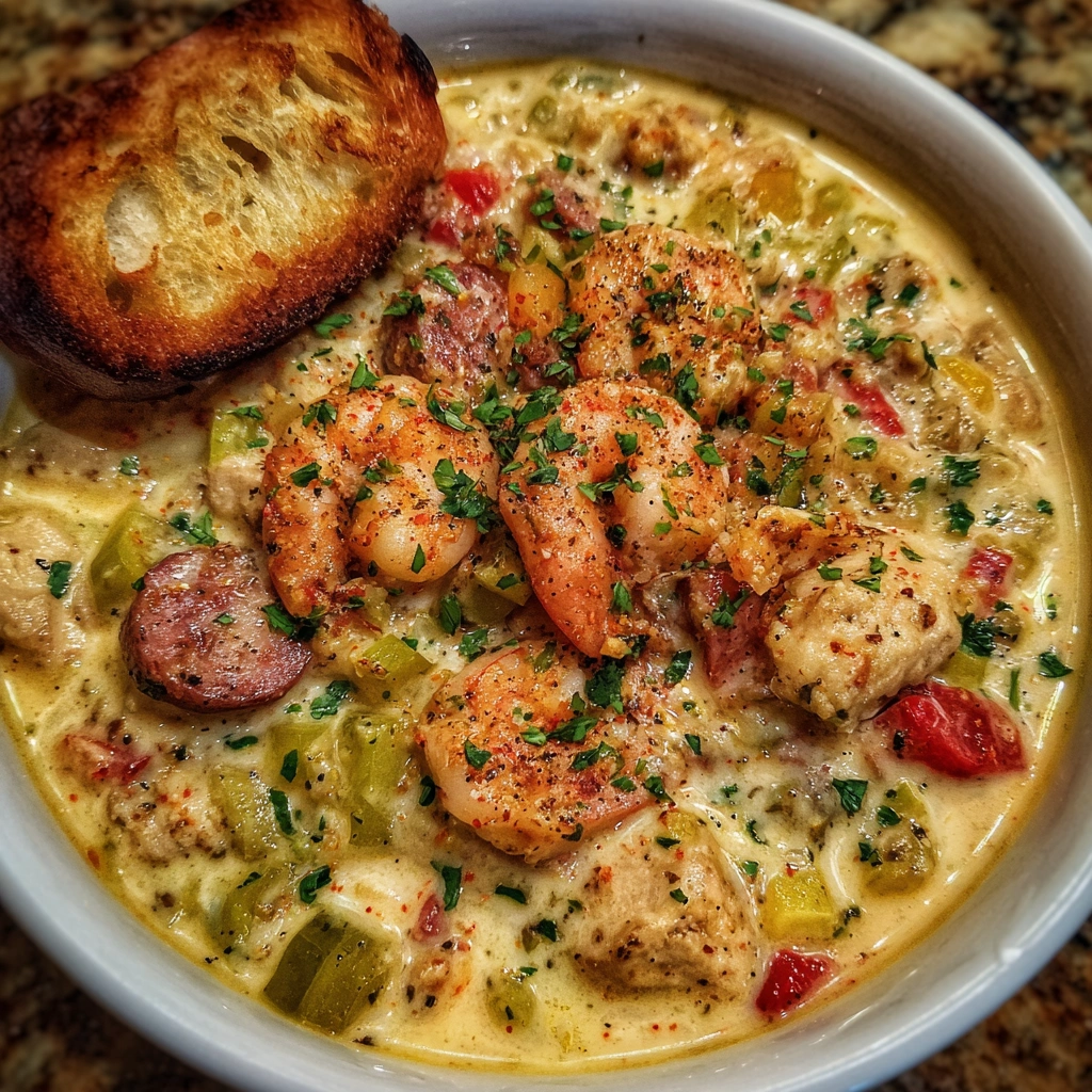 As I plate this Cajun White Chicken Chili, I feel a little victory dance in the kitchen. The creamy comfort, the zing of Cajun spices, and the hearty mix of chicken, sausage, shrimp, and beans come together without fuss. It’s a recipe I return to when time is short but cravings are tall. Leftovers taste just as bright, and the one-pot method keeps cleanup humane. I love how adjustments—heat level, dairy, or bean thickness—let me tailor it for family nights or last-minute guests. Dinner becomes a warm, shared moment, not a rushed chore. That joy keeps me cooking with love.
