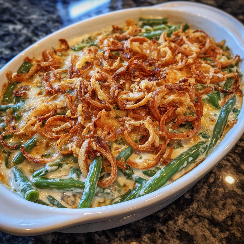 Grandma’s Green Bean Casserole—a cozy, creamy classic with crispy onions that evokes family memories.