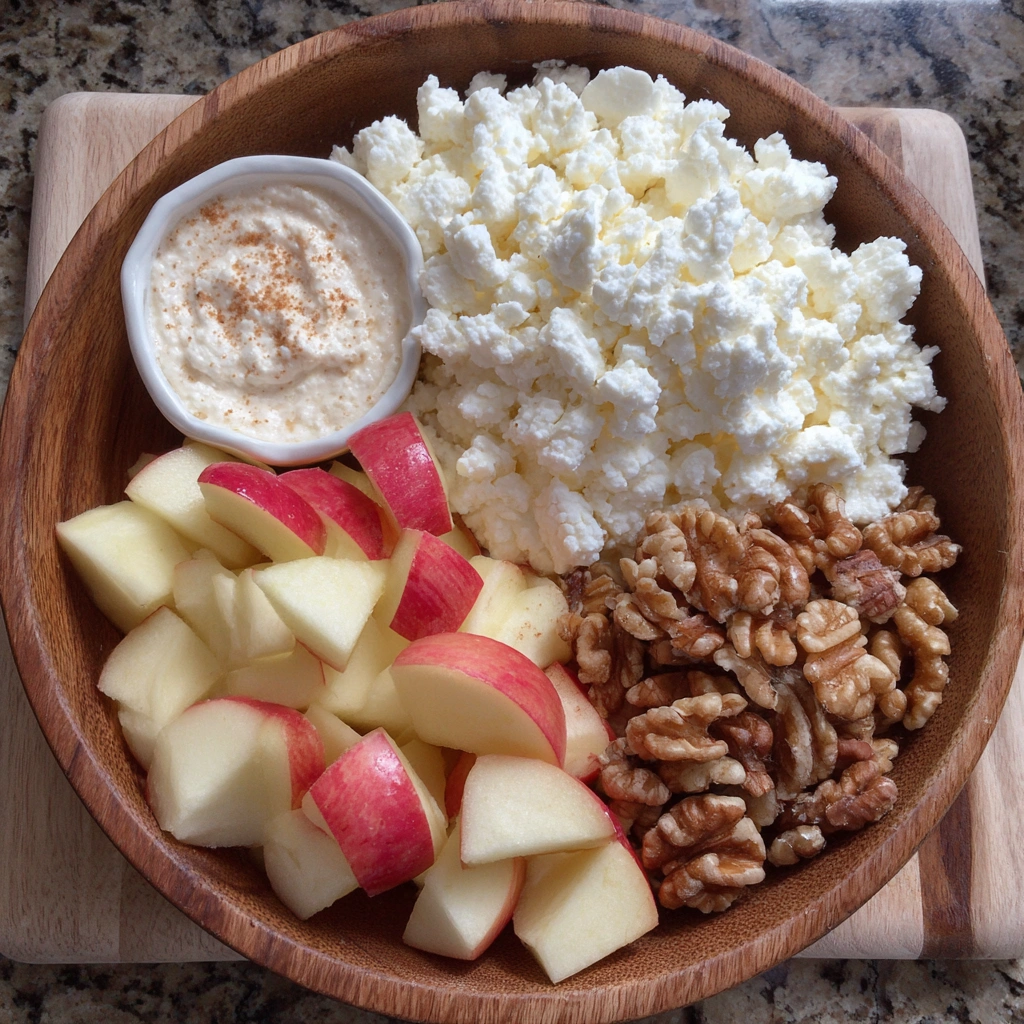 If you want silkier texture, use a spoon or spatula. Taste as you go and adjust sweetness to your liking. The mix should feel smooth and forgiving, so don’t rush. A quick beat with a fork also works if you don’t have a whisk. If using very thick cottage cheese, a minute of gentle stirring helps. Chill the mixture 5 minutes if it seems too stiff. Now you’re ready for the apples to join in.